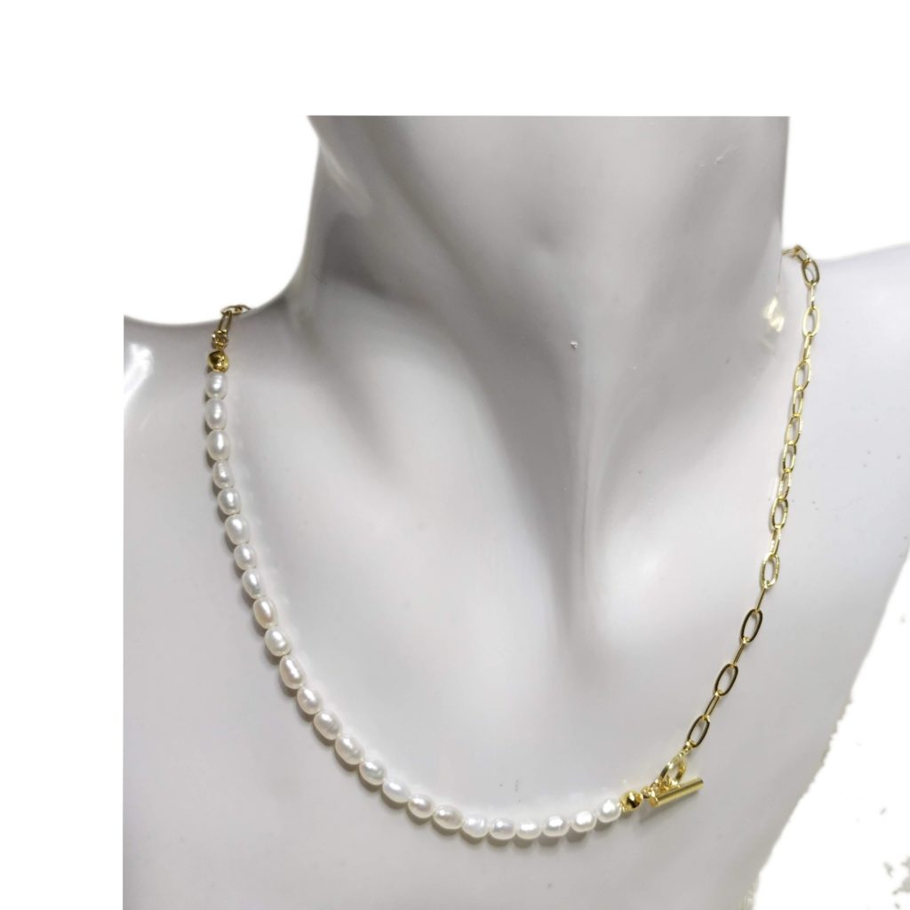 Deliziosa collana realizzata con catena placcata oro e perle barocche chicchi di riso. La collana ha chiusura t-bar argento 925 placcata oro. Collana lunga cm 48 ( 18,8 inches).