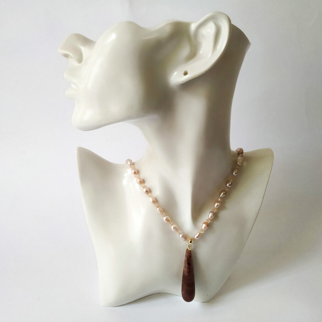 Collana di perle naturali di acqua dolce e cristalli con pendente a goccia in quarzo