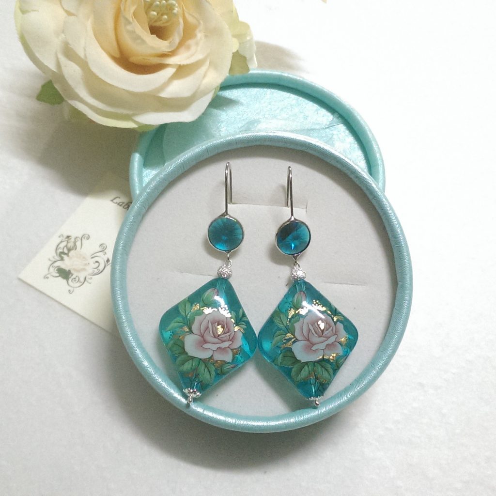 Orecchini con perle tensha, argento 925, colore azzurro aquamarina, con disegno di rose. La superficie della perlina è decorata con decalcomanie di tematica floreale.
