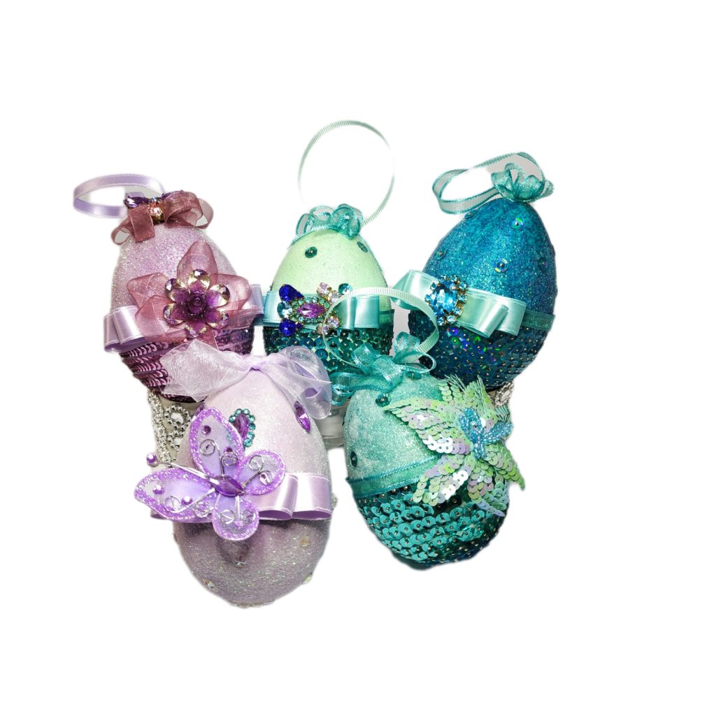 Set 5 uova di Pasqua ornamentali dipinte a mano, decorate con paillettes, pietre e nastri. Uova di pasqua ornamentali dipinte a mano, deliziose come souvenir o regalo unico per la tua famiglia e i tuoi amici. Ogni uovo di Pasqua è un ornamento diverso. Tutte le mie creazioni sono progettate e realizzate a mano da me. Le uova sono alte cm 10 circa